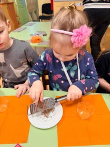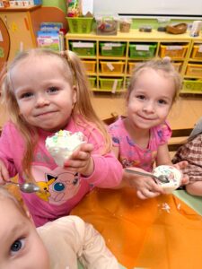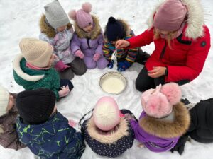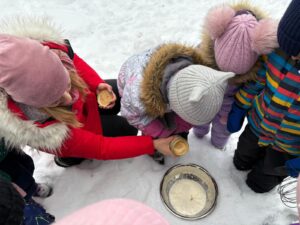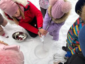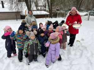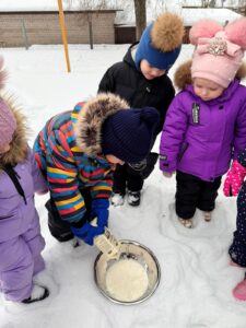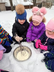 Šogad mūs priecēja īsta sniegaina ziema, un 22.janvārī STEAM dienas ietvaros 11. grupa “Saules zaķītis” piedalījās neparastā un izzinošā aktivitātē – saldējuma gatavošanā sniegā pēc īpašas receptes. Praktiskajā darbībā bērni eksperimentēja ar dažādu vielu īpašībām, novērojot, kā sniegs un zem bļodas pievienotais sāls palīdz ātrāk sasaldēt masu. Gatavošanas procesā tika izmantots saldais krējums, iebiezinātais piens un pacietība. Bērni ar lielu interesi un prieku iesaistījās visos aktivitātes posmos – no eksperimentēšanas līdz kopīgai degustēšanai. Šī STEAM aktivitāte veicināja bērnu zinātkāri, radošo domāšanu, sadarbības prasmes un izpratni par dabas procesiem.